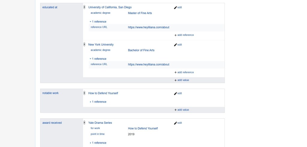This artifact comes from Metadata for Digital Resources, LIS 882, taken in my penultimate semester of school. For this assignment, we were to select a person without a Wikidata page and create one for them. I selected nonbinary playwright Liliana Padilla, a 2019 finalist for the Susan Smith Blackburn Prize. I love this assignment because there are finally real-world connections to my library school work and because we were exposed to a current technology that aims to meet diverse needs for a number of different fields of study and type of user. I was also forced to select elements to add to the Wiki page based on what I thought other users might find helpful, such as Padilla’s alma mater or their prize history.